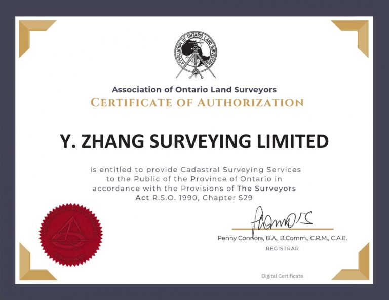 Y. ZHANG SURVEYING LIMITED is entitled to provide Cadastral Surveying Services to the public of the province of Ontario in accordance with the provisions of the Surveyors Act.